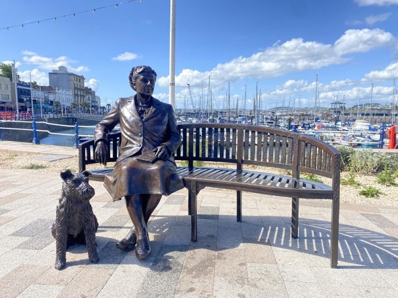 Estátua de Agatha Christie e seu cachorro à beira-mar em sua cidade natal: Torquay, Devon, Inglaterra. Foto: Torbay Council / English Riviera BID Ltd / Elisabeth Hadley
