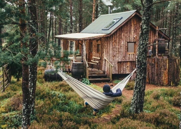Vista para a cabana Lazy Duck, em uma floresta de pinheiros, perto de Aviemore, em Cairngorms, Escócia. Foto: VisitBritain / Jack Boothby