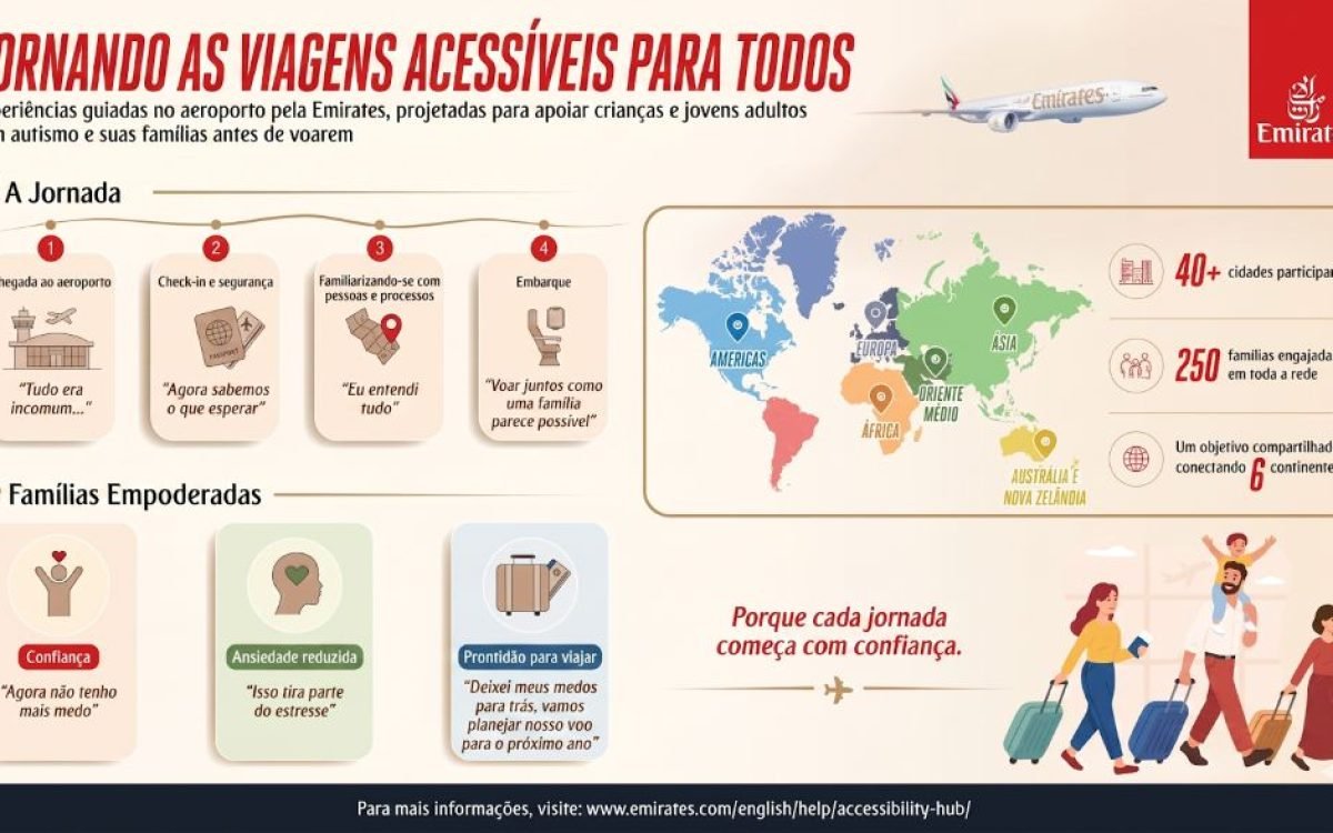 No último ano, a Emirates implementou um programa de testes preparatórios em aeroportos de mais de 40 cidades para atender passageiros neurodivergentes. A iniciativa já englobou mais de 250 famílias, oferecendo a crianças e jovens a chance de vivenciar as etapas de um embarque antes do dia do voo, com o intuito de reduzir a ansiedade gerada pela viagem.