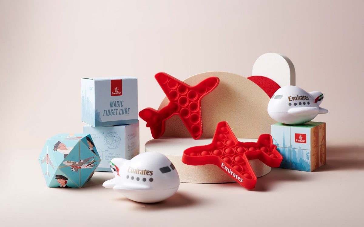 A Emirates projetou uma linha de produtos sensoriais e fidget toys para passageiros de todas as idades, que estarão disponíveis a bordo em todas as classes de cabine, a partir de 1º de novembro de 2025. Produtos sensoriais e fidget toys são amplamente reconhecidos por sua capacidade de oferecer estimulação controlada para mentes neurodivergentes, permitindo que um sistema superestimulado se acalme e se reequilibre. Para apoiar os clientes nessa situação, a Emirates projetou alguns tipos de produtos para o alívio da tensão à bordo, sendo eles dois brinquedos de borracha no formato de uma aeronave e dois tipos de cubos sensoriais. Os itens serão oferecidos aos passageiros neurodivergentes e até mesmo a passageiros nervosos com o voo, se aplicável.