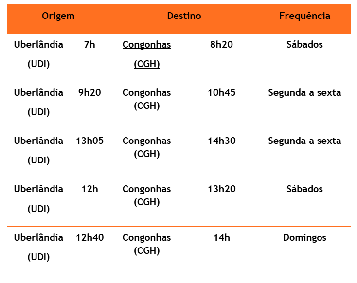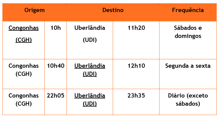 Congonhas (CGH) – Uberlândia (UDI): a partir de 29/03/2026