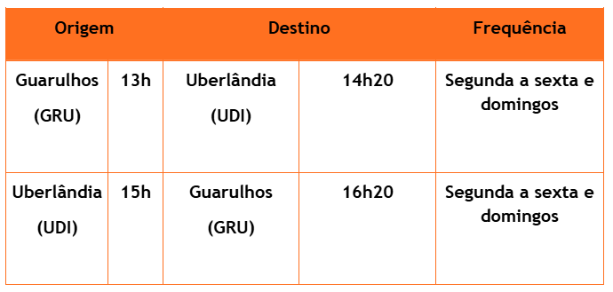 Uberlândia (UDI) – Guarulhos (GRU): a partir de 01/06/2026