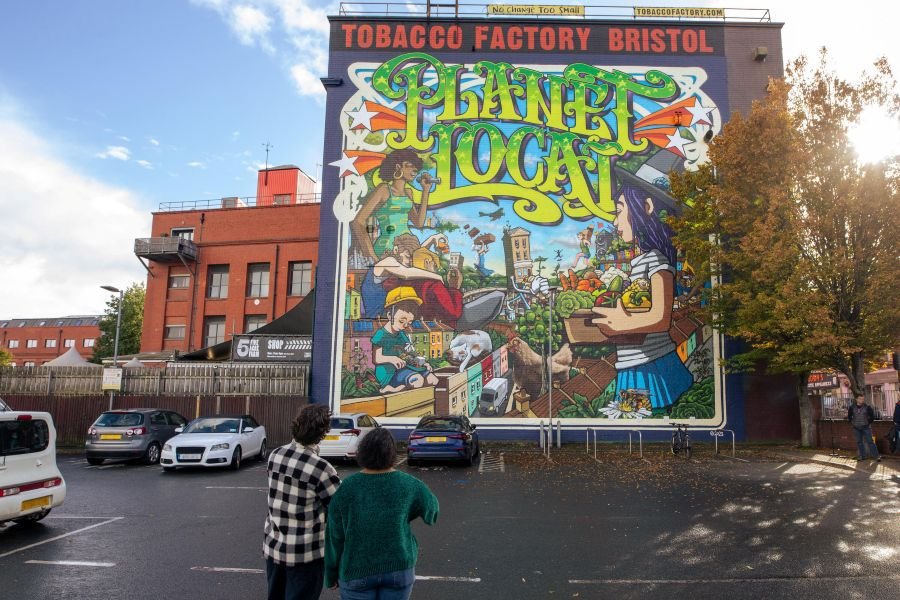 Mural da The Old Tobacco Factory, em Bristol. Foto: VisitBritain/Pinzutu/Local Futures/Tobacco Factory/Upfest/Inkie & Silent Hobo