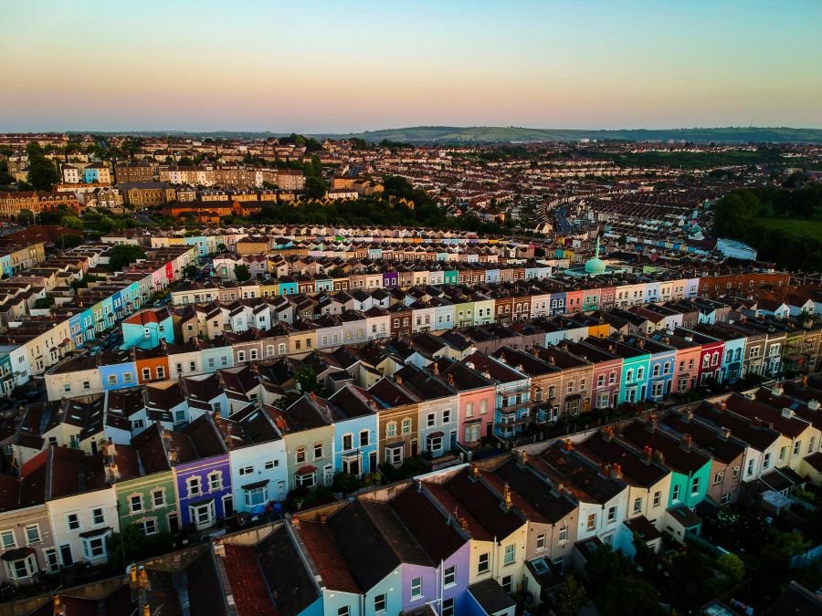 Vista aérea de Bristol, com as icônicas casas geminadas coloridas. Foto: VisitBritain/Max Renaud