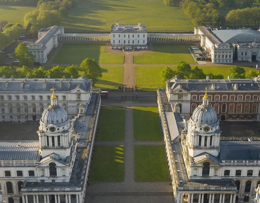 Vista aérea da Queen’s House em Londres: cenário dos passeios da realeza na série. Foto: National Maritime Museum, Greenwich, London, 2024