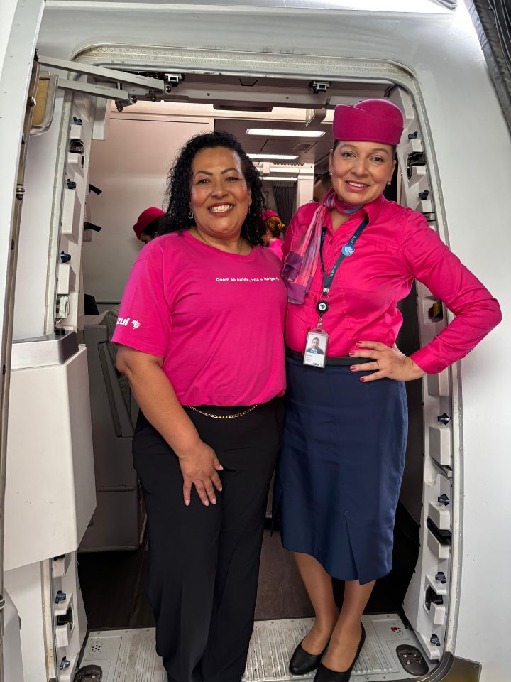 O embarque, não por acaso, foi feito, em 1º de outubro, em uma aeronave rosa e com tripulação 100% feminina e uniformizada de rosa, cor que a Azul adotou há mais de uma década. O voo AD 8750 inaugurou as principais ações da Azul que marcam a sua maior campanha social, de saúde e bem-estar, voltada à prevenção e ao apoio no tratamento do câncer de mama no Brasil.