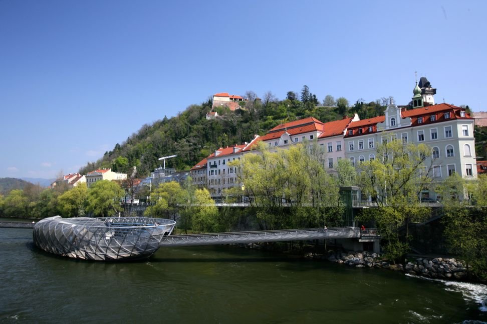 Ilha no rio Mur (Murinsel) com vista para o Schlossberg. Foto: © Turismo de Graz / Harry Schiffer