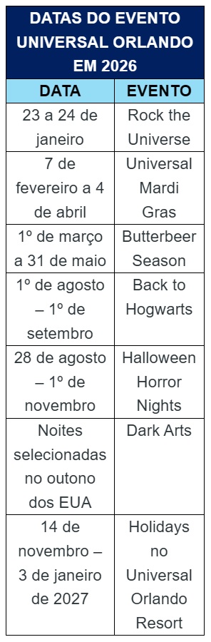 Veja abaixo um resumo das experiências e eventos de 2026 no Universal Orlando Resort: